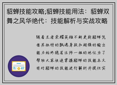 随着《王者荣耀》英雄不断更新,貂蝉凭借其独特的飘逸身段和超强的输出能力,始终稳居法师一姐的地位。为了帮助大家快速掌握貂蝉的技能,本文将对貂蝉的技能进行解析,并提供实战攻略,助你轻松驾驭风华绝代的舞姿。...